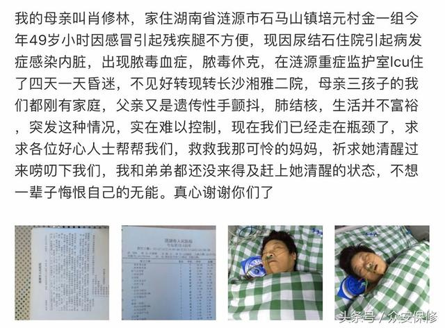 近日一则通过公益平台发出的求助链接传播在社交群里:延保工程师刘师傅母亲因“尿结石住院引起并发症感染内脏”紧急转入重症监护室ICU病房,不见好转……